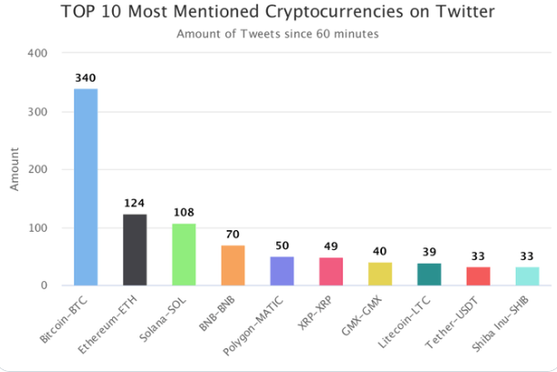 4위~10위에는 바이낸스코인(BNB, 70회), 폴리곤(MATIC, 50회), 리플(XRP, 49회), 지엠엑스(GMX, 40회), 라이트코인(LTC, 39회), 테더(USDT, 33회), 시바이누(SHIB, 33회) 등이 이름을 올렸다.