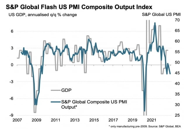 PMI는 50을 기준으로 업황의 확장과 위축을 가늠하는 만큼, 서비스업이고 제조업이고 모두 위축 국면에 들어가 있다는 얘기입니다. S&P글로벌은 '경기 침체가 모멘텀을 얻었다'라고 표현했습니다. 크리스 윌리엄슨 S&P글로벌 이코노미스트는 "사업 여건이 악화하고 있다. PMI를 보면 4분기 GDP 성장률은 마이너스 1.5% 수준일 것으로 예상한다"라고 말했습니다.
