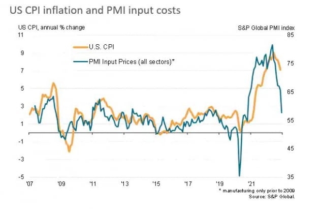 경기 침체 우려가 커졌지만, 시장이 주목한 건 투입 가격이 큰 폭으로 하락한 것이었습니다. 투입 가격은 7개월 연속 완화되어 2020년 10월 이후 2년 만에 가장 느린 상승 속도를 보였습니다. 윌리엄슨 이코노미스트는 "12월에는 2020년 4월 코로나 봉쇄 때만 제외하면 설문조사의 13년 역사에서 가장 큰 폭의 투입비용 냉각을 볼 수 있었다. Fed의 금리 인상은 인플레이션에 원하던 효과를 낳고 있지만, 경제의 비용이 올라가고 있고 침체 위험은 점점 커지고 있다"라고 설명했습니다. 바이탈 날리지는 "PMI 보고서를 보면 디스인플레이션 압력은 극적으로 높아지고 있다. Fed의 예측은 2022년처럼 내년에도 틀릴 것"이라고 주장했습니다.