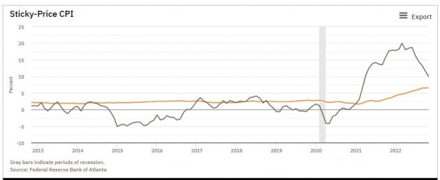 윌리엄스는 "우리는 인플레이션을 2%로 되돌리는 데 필요한 것을 할 것"이라며 최종금리가 "우리가 FOMC에서 적어냈던 것(5.1%)보다 더 높을 수 있다"라고 밝혔습니다. 그는 "높은 서비스 부문의 인플레이션은 여전히 문제다. 커다란 수급 불균형을 고려하면 이 부분의 인플레이션은 아마도 좀 더 지속할 수 있다"라며 제롬 파월 의장과 비슷한 논리를 쳤습니다. 사실 애틀랜타 연방은행이 잘 변하지 않는 물가 요소(교통비 주거비 교육비 의료비 등)만을 모아 집계하는 '끈적끈적한' CPI(Sticky-Price CPI)의 경우 11월에도 10월과 같은 5.5%로 집계됐습니다. 상승 추세가 유지되고 있습니다. 변동성이 큰 에너지 등을 빼면 물가가 별로 떨어지지 않고 있다고 볼 수도 있습니다. 윌리엄스 총재는 '기준금리를 6~7%까지 높여야 한다'는 일부 주장에 대해선 "그건 분명히 내 기준점은 아니다"라고 말했습니다.