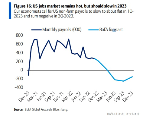 뱅크오브아메리카는 "중앙은행들의 긴축은 내년 중반의 경기 경착륙으로 이어질 것이다. Fed는 지난 9개월 동안 400bp 이상 금리를 올렸고 향후 5~6개월 동안에도 추가로 50~75bp를 올릴 것이다. ECB는 지난 6개월간 250bp를 인상했고 앞으로 9개월 동안 125bp 추가 인상이 예상되는 상황이다. 이런 상황에서는 노동시장이 빨리 붕괴되는 게, 약세장을 빨리 끝내는 방법"이라고 분석했습니다.