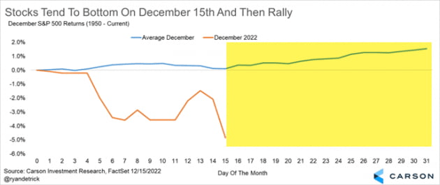 산타클로스 집회는 나타날까요? LPL 파이낸셜의 퀸시 크로스비 수석 글로벌 전략가는 여전히 다음주에 산타 랠리가 나타날 수 있다고 예상합니다. 악화한 투자심리로 인해 깊어진 과매도를 고려하면 랠리가 나타날 것이란 것입니다. 반면 울프리서치는 S&P500 지수는 지난 화요일 (CPI가 나온 뒤) 장중 격렬하게 반전했고 목요일 21일 최저치를 기록했다면서 연말까지 내림세가 나타날 것으로 예상했습니다. 트루이스트 어드바이저리의 키스 러너 CIO는 "사람들은 연말까지 랠리를 기대하고 있었고, 이제 사람들이 그것을 포기하는 것을 보기 시작했다. 그것이 조금도 랠리가 없을 것이란 걸 의미하지는 않는다. 그러나 모든 유형의 상승은 아마도 예상보다 더 조용할 것"이라고 말했습니다.