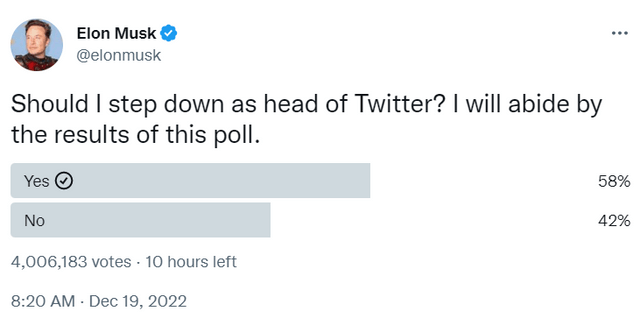 19일(현지시간) 일론 머스크는 트위터를 통해 "트위터 대표직에서 물러나야 할까요? 이번 설문 조사 결과에 따르겠다"면서 사임 여부를 가르는 투표를 게시했다.