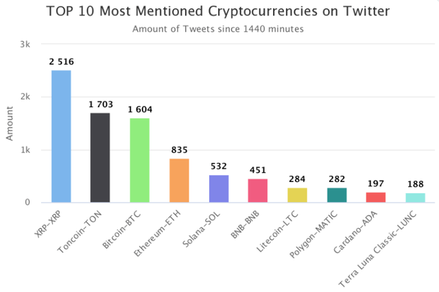 4위~10위에는 이더리움(ETH, 835회), 솔라나(SOL, 532회), 바이낸스코인(BNB, 451회), 라이트코인(LTC, 284회), 폴리곤(MATIC, 282회), 카르다노(ADA, 197회), 테라 루나 클래식(LUNC, 188회) 등이 이름을 올렸다.