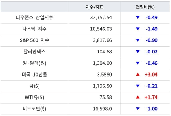 페이스북 모기업 메타는 유럽연합(EU)이 메타가 반독점 금지법을 위반했다는 예비 의견을 내놓으면서 4.14% 폭락했다. 아마존은 3.33% 하락했다. 이외에도 알파벳이 2.02%, 애플이 1.59%, 마이크로소프트 1.73%, 엔비디아가 1.91% 하락 마감했다.