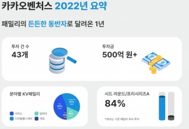 카카오의 스타트업 전문 투자사 카카오벤처스 역시 올해 43개 스타트업에 투자를 진행해 전년 대비 12건 많은 투자를 집행했다. 신규 투자는 31건으로 대부분 극초기 단계가 주를 이룬다. 투자액은 총 500억원 이상이다. 분야별로 서비스와 디지털헬스케어가 각각 16건, 이어 딥테크(고기술 기반 기업) 7곳, 게임 4곳 등이다. 카카오 역시 신성장 동력으로 삼은 헬스케어 부문에스 신규 기업 발굴이 집중적으로 이뤄졌다.