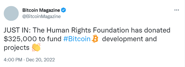 20일(현지시간) 가상자산(암호화폐) 전문 미디어 비트코인매거진에 따르면 국제인권단체 휴먼라이츠파운데이션(HRF)이 32만5000달러를 비트코인(BTC) 업계 발전을 위한 보조금으로 제공한다고 발표했다.
