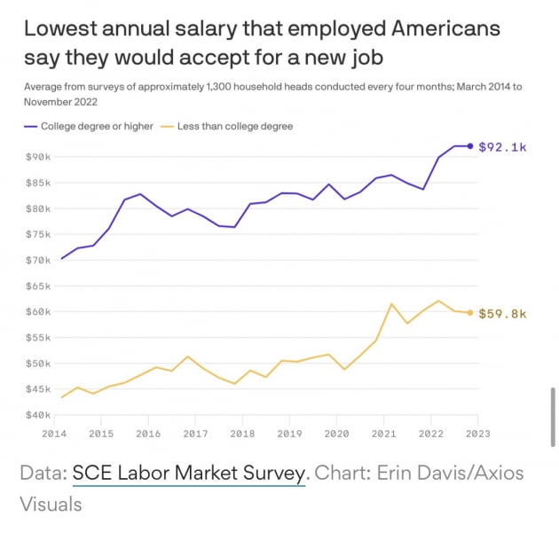 파월 의장이 주시하는 건 주거비를 제외한 서비스 인플레이션입니다. 오늘 뉴욕 연방은행이 발표한 11월 노동시장 설문조사 결과를 보면 응답자가 새 일자리를 수락할 의향이 있는 최저 임금은 7만3667달러로 조사됐습니다. 2014년 조사가 시작된 이래 최고 수준입니다. 대학졸업자 이상의 경우 9만2100달러, 고졸자 이하의 경우 5만9800달러인 것으로 나타났습니다. 이렇게 기대하는 임금이 높으면 임금 상승이 이어지거나, 노동시장 참여율이 낮게 유지될 것입니다. 노동시장을 냉각시키려는 Fed의 노력에는 부정적입니다.