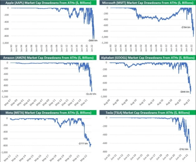 최근 시장은 기술주가 무너지는 걸 주시하고 있습니다. 베스포크 그룹에 따르면 뉴욕 증시의 시가총액은 지난 1월 3일 연고점에서 어제까지 11조 7000억 달러 감소했습니다. 이 중 5조 달러 이상 손실이 애플, 마이크로소프트, 아마존, 알파벳, 메타, 테슬라 등 6개 주식에서 발생했습니다. 애플은 8800억 달러, 알파벳은 8460억 달러, 메타와 테슬라는 각각 7600억 달러 이상, 마이크로소프트는 7840억 달러 가치를 잃어버렸습니다. 특히 아마존은 시가총액 1조 달러 이상이 날아갔습니다. 베스포크 그룹은 "불과 몇 년 전만 해도 시가총액이 1조 달러를 넘는 회사가 없었지만, 지금은 시가총액을 1조 달러 이상 잃어버린 기업이 있다"라고 지적했습니다.