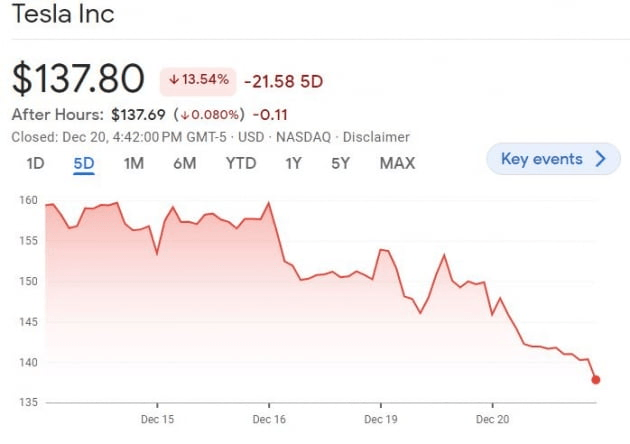 기술주들은 오늘은 전반적으로 보합세(애플 -0.05%, 아마존 0.32%, 마이크로소프트 0.56% 등)를 보였습니다. 하지만 테슬라는 또 8.05% 폭락했습니다. 지난 7거래일 중 6일, 지난 12거래일 중 10일 동안 하락해서 2020년 11월 이후 최저치로 떨어졌습니다. CNBC는 일론 머스크가 '트위터를 경영할 새 CEO를 적극적으로 물색하고 있다'라고 보도했지만, 폭락세를 막을 수 없었습니다. 에버코어ISI의 크리스 맥널리 애널리스트는 "테슬라의 주가에서 150~163달러는 추가 하락을 저지하기 위해 지켜야 할 중요한 (기술적) 지점이었는데 사수에 실패했다. 이는 저점 100달러 가능성을 살려놓는다. 투자자들은 이제 브랜드가 피해를 볼 가능성을 두려워한다"라고 밝혔습니다. 에버코어는 목표가를 300달러에서 200달러로 낮췄습니다.