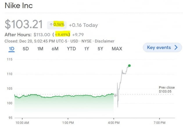 나이키의 경우 분기 매출(133억 2000만 달러)이 전년 동기(113억 6000만 달러)나 월가 예상(125억 7000만 달러)보다 훨씬 많았습니다. EPS(85센트)도 전년 동기(83센트)나 예상(64센트)보다 좋았습니다. 물론 재고는 전년보다 43%나 증가한 93억 달러를 기록했지만, 전분기의 97억 달러보다는 감소했습니다. 판매관리비가 전년 대비 10% 증가했고, 총마진은 1년 전 45.9%에서 42.9%로 줄었습니다. 직판 매출은 16% 증가한 54억 달러, 디지털 매출은 25% 증가한 것으로 나타났습니다. 다만 중국 매출은 3% 감소했습니다. 나이키의 주가는 장중 0.16% 오른 뒤 시간 외에서는 9.49% 폭등하고 있습니다.