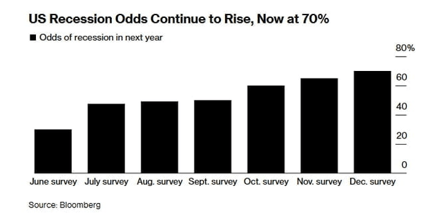 이날 블룸버그는 월간 이코노미스트 설문조사를 통해 미국 경제학자들의 경기침체 전망을 공개했다. 지난 12일(현지시간)부터 16일 사이 진행된 설문조사에는 38명의 경제학자가 참가했고 내년 경기침체 전망은 약 70%로 집계됐다. 이는 지난 9월 50%, 10월 60%, 11월 65%에 비해 늘어난 수준이다.