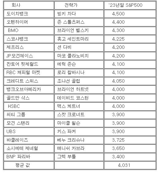 마켓워치가 월가 전략가들을 대상으로 실시한 최근 설문조사에서 전략가들은 2023년 말 평균 S&P 500 추정치를 4,031로 제시했다. 이는 화요일 종가 3,821.62에서 약 6% 상승에 그친 수준이다.