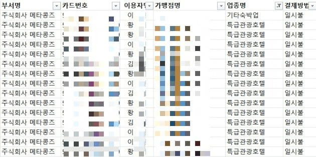 블루밍비트가 입수한 메타콩즈 법인카드 사용내역에서 발견한 경영진들의 서울시내 특급호텔 투숙 내역(사진=양한나 기자)