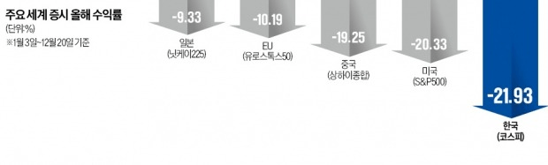 올해 국내 증권시장이 최악의 성적표를 받아 들었다. 코스피지수는 20% 넘게 급락해 2008년 이후 14년 만에 가장 큰 하락폭을 기록했다. 주요 20개국(G20) 중 꼴찌 수준의 수익률이다.