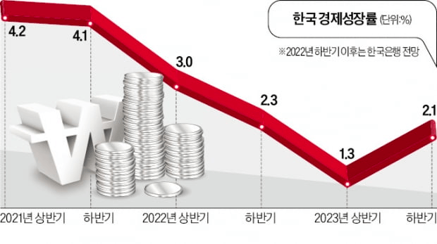 한국 경제의 성장도 잠재 수준(2%)을 밑돌 것으로 한은은 내다봤다. 특히 내년 상반기 성장 부진이 두드러질 것으로 전망했다. 한은은 "소비는 회복세를 이어가겠지만 금리 상승 등으로 그 속도가 점차 완만해질 것"이라며 "수출과 투자는 주요국 성장세 둔화 등의 영향으로 부진할 것"으로 예상했다. 이어 "하반기 이후에는 대외 불확실성이 줄어들면서 부진이 점차 완화될 수 있다"면서도 "주요국 통화긴축 속도, 지정학적 갈등 전개 양상 및 중국 방역정책 변화 등이 잠재적인 리스크 요인"이라고 덧붙였다.