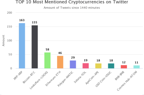 26일 오전 트위터 언급 횟수, 1위 XRP·2위 BTC