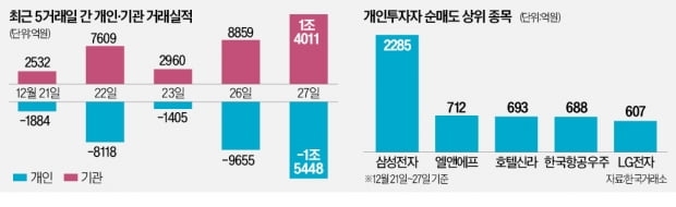 대주주 양도소득세 기준일인 27일 개인투자자들이 국내 증시에서 주식 1조5448억원어치를 팔아치웠다. 주식 양도세 대상이 되는 대주주 요건이 10억원으로 유지되면서 연말 '매물 폭탄'이 올해도 반복됐다. 개인이 쏟아낸 물량은 그대로 기관투자가가 받아냈다. 연말 배당을 노린 프로그램 매수세가 대거 유입된 영향이다. 증권가에서는 28일부터 '기관이 팔고 개인은 사는' 정반대 양상이 나타날 것이라는 관측이 나온다.