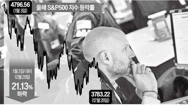 지난해 글로벌 투자은행(IB) 골드만삭스는 올해 말 S&P500지수가 5100선에서, 모건스탠리는 4400선에서 마감할 것으로 예상했다. 하지만 이날 S&P500지수는 연초(1월 3일)보다 21.13% 하락한 3783.22에 장을 마쳤다. 애널리스트들이 S&P500을 실제보다 40% 가까이 높게 예측한 셈이다.