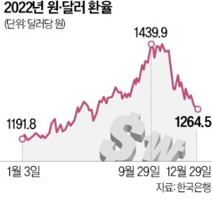올해는 Fed의 긴축 정책이 상반기께 마무리되면서 원·달러 환율은 하반기부터 내릴 것으로 예상됐다. SK증권은 원·달러 환율이 올해 1분기 1410원까지 올랐다가 4분기께 1230원까지 내릴 것으로 관측했다. 국민은행은 1분기 1335원, 4분기 1255원으로 전망치를 내놨다.