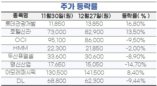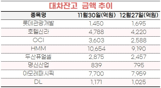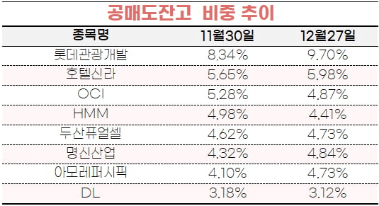 우선 작년 11월 말부터 주주명부 확정일인 12월27일까지의 공매도잔고 추이를 살펴봤다. 11월 말 기준 공매도잔고 비중이 가장 높았던 종목은 ▲ 롯데관광개발(8.34% 공매도잔고 금액 715억원) ▲ 호텔신라(5.65%, 1620억원) ▲ OCI(5.28%, 1198억원) ▲ HMM(4.98%, 5429억원) ▲ 두산퓨얼셀(4.62%, 1017억원) ▲명신상업(4.32%, 400억원) ▲ 아모레퍼시픽(4.10%, 3132억원) ▲ DL(3.18%, 458억원) 순으로 나타났다.