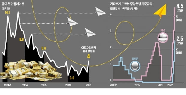 인플레이션의 귀환은 이런 확신을 뿌리째 흔들었다. 코로나19 이후 각국 중앙은행이 금리를 내리고 '헬리콥터에서 돈 뿌리기'식으로 유동성을 풀 때만 해도 '인플레 경고'는 거의 없었다. 1970~1980년대 퇴치했다고 여겨진 인플레이션이 되살아나자 각국 중앙은행은 패닉에 빠졌다. 고물가를 잡기 위해 부랴부랴 금리를 올리면서 경제가 크게 휘청였다. 제롬 파월 미국 중앙은행(Fed) 의장은 "우리가 인플레이션에 대해 얼마나 이해를 못 하고 있었는지 이제야 알게 됐다"고 '반성문'을 썼다.