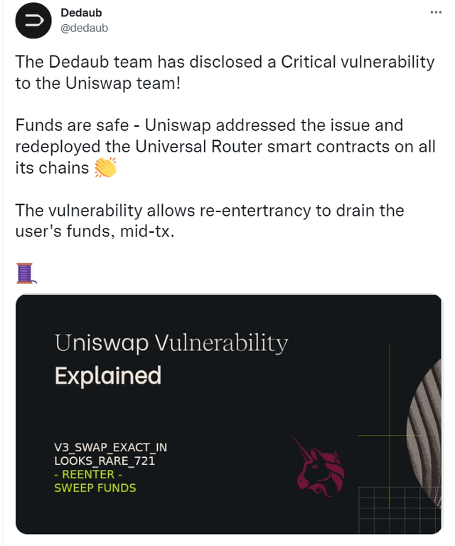 디도브 팀은 "취약점으로 인해 트랜잭션 중간에 재진입 시 사용자의 자금이 손실을 입을 가능성이 있었다"며 "유니스왑은 관련 문제를 해결하고 모든 체인에 범용 라우터(Universal Router) 스마트 컨트랙트를 재배포했다"고 설명했다.