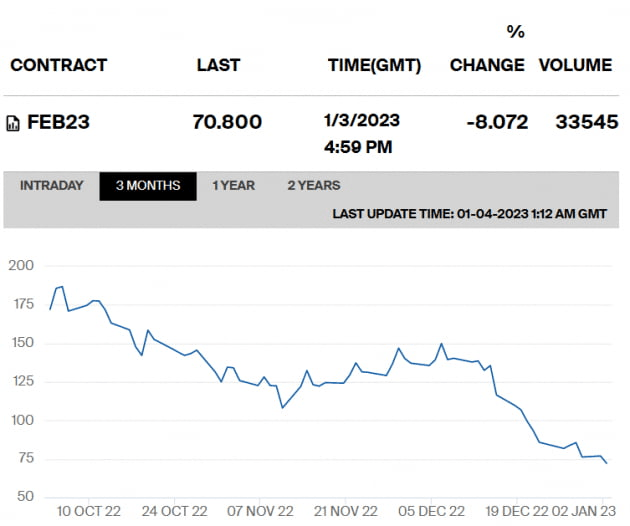 3일(현지시간) 런던ICE거래소에서 유럽 천연가스 기준물인 네덜란드 TTF 가스 선물(2월물)의 MWh당 가격은 전일 대비 6.1% 하락한 72.314유로를 기록했다. 지난 2월 말 러시아가 우크라이나를 침공했을 때 가격인 88유로보다 18% 낮다.