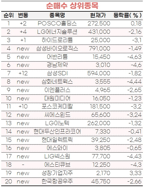 미래에셋엠클럽에 따르면 미래에셋증권 계좌로 주식을 거래하는 수익률 상위 1%의 고수들은 4일 오전 10시까지 POSCO홀딩스를 비롯해 LG에너지솔루션, 하이드로리튬을 가장 많이 순매수한 것으로 집계됐다. 그 뒤를 삼성바이오로직스, 어반리튬, 경남제약 순으로 나타났다.
