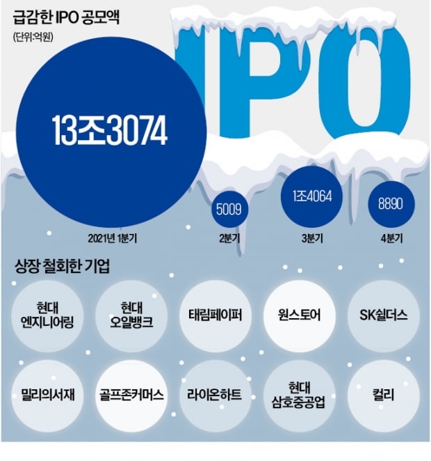 기업공개(IPO) 빙하기가 연초에도 이어지고 있다. 새벽배송 업체 컬리가 4일 상장을 연기했고 지난 3일엔 현대삼호중공업이 상장 계획을 아예 접었다. 주식시장 침체로 기업가치를 제대로 평가받기 어렵다는 판단에서다. 공모주 투자 심리도 악화일로다. 기관 수요예측과 일반청약 경쟁률은 최근 3년간 최저치로 떨어졌다.