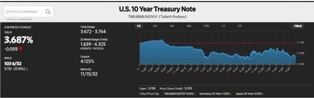 뉴욕 채권 시장에서 10년물 금리는 오후 5시께 전날보다 5.9bp 내린 3.687%로 거래됐습니다.