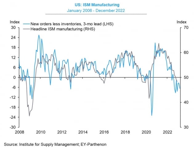 특히 세부 지수중 신규수주 지수는 45.2(11월 47.2)로 2020년 5월 이래 가장 낮았습니다. 4개월째 50을 밑돌았습니다. 지불가격 지수는 39.4(11월 43.0)까지 떨어져 9개월 연속 하락했습니다. 지불가격 하락은 인플레이션에 긍정적이지만, 대부분 에너지 가격 하락에 따른 것입니다. 대부분 지수가 떨어졌지만 오른 게 있습니다. 고용 지수는 12월 51.4(11월 48.4)를 기록해 다시 확장세로 전환됐습니다. 경기가 악화하고 있는데도, 기업들이 여전히 고용을 확대한 것입니다. 다만 ISM 측은 휴일 등으로 해고가 감소했고, 11월부터는 채용 동결, 감원, 해고를 통해 고용 수위를 낮추는 등 노사관리의 정서가 바뀌고 있다고 지적했습니다.