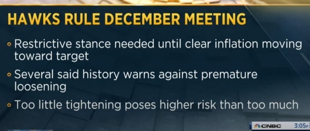 -참가자들은 11월 회의 이후 금융여건이 완화되었다고 지적했다. 통화 정책이 금융 시장을 통해 중요하게 작용하기 때문에 Fed 행동(금리 인상 속도 조절)에 대한 대중의 오해로 금융여건이 부적절하게 완화되면 물가 안정을 회복하려는 노력을 복잡하게 만들 것이라고 언급했다→→→주가가 오르고 금리가 내려가는 게 불편하다.