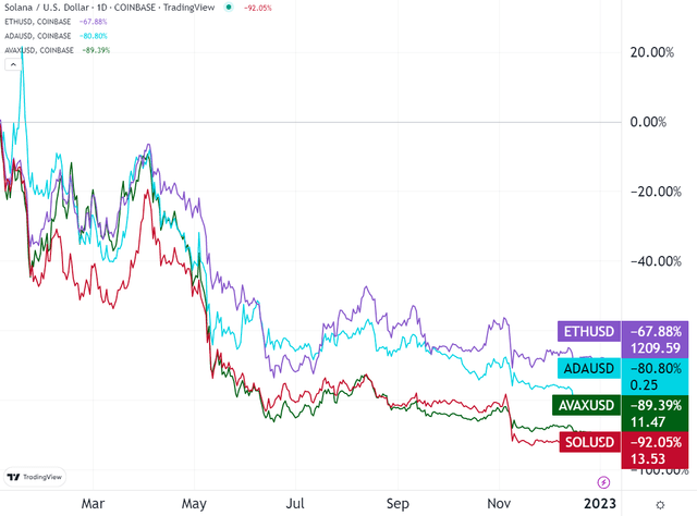 잠재적인 "이더리움 킬러"로 불렸던 솔라나는 2022년에 최악의 실적을 기록했다. 솔라나 네트워크의 솔라나 코인(SOL)은 92% 하락했지만, 그것만이 솔라나 생태계에 대한 유일한 척도는 아니다. 사기혐의를 받고 있는 샘 뱅크먼 프리드(SBF)가 이끌었던 FTX의 자회사 알라메다 리서치의 투자를 받는 등 솔라나는 FTX 관련 코인으로 분류된다.