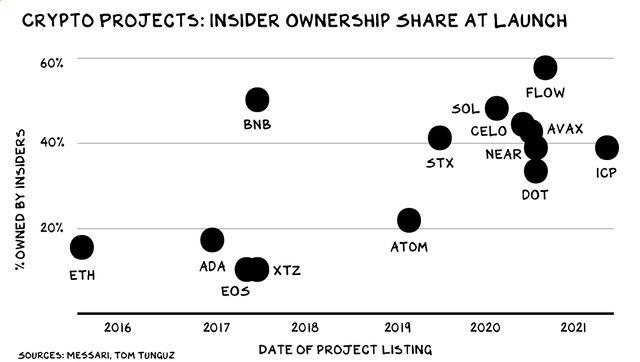 지난 7월, 미국 투자자들은 솔라나 내부자가 이익을 얻는 대신 투자자들이 손해를 입었다며 캘리포니아주 연방법원에 솔라나에 대한 집단소송을 제기했다. 정확하게는, 솔라나랩스(Solana Labs)가 미등록 증권인 솔라나 코인(SOL)를 이용해 이익을 취했다는 것이었다.원고 측 마크 영(Mark Young)은 SOL 배분 방식이 하위테스트(Howey Test) 하의 증권 기준에 부합한다고 강조했다. 다시 말하자면, 솔라나의 내부자와 프로모터들이 이익을 기대하고 솔라나랩스와 솔라나재단에서 발행한 SOL의 상당수를 보유한다는 것이다.암호화폐 전문 데이터 분석 회사 메사리(Messari)의 톰 퉁구즈(Tom Tunguz)에 따르면 솔라나는 가장 중앙집중화된 암호화폐 중 하나다.2022년 1월까지 거의 절반에 달하는 SOL 코인은 내부자의 월렛에 있었다. 반면에 이더리움은 중앙집중화 스펙트럼에서 솔라나와 정반대에 위치한다.