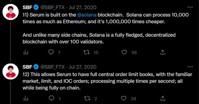 알라메다의 SOL 코인은 파산관리자가 보관하고 있다고 알려졌으며, 솔라나는 첫 제네시스블록이 생성되었던 2020년 3월 16일 이후 짧은 역사상 가장 큰 매도세에 직면했다. 게다가 SBF는 이더리움의 유니스왑에 해당하는 솔라나 기반 탈중앙화거래소 세럼(Serum, SRM)에 직접 투자하고 홍보했다.