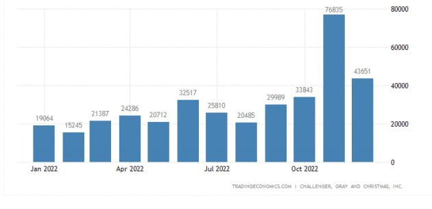 챌린저, 그레이 앤드 크리스마스(CG&C)가 발표한 기업들의 지난해 12월 감원 계획은 4만3651명으로 나타났습니다. 이는 지난해 11월(7만6835명)보다 43% 줄어든 것입니다. 사실 지난 11월에 갑자기 10월(3만3843명)보다 두 배가량 감원이 급증해 기업 감원이 본격화하나 했었는데 그게 일시적이었던 셈입니다.