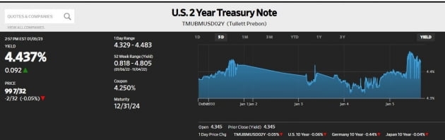 전날 ISM의 12월 제조업 구매관리자지수(PMI)에서 고용지수가 다시 높아지고, 11월 구인 이직 보고서(JOLTS)에서 채용공고 수치가 여전히 역사적으로 많은 1000만 건 이상을 유지하는 등 고용 지표들은 꺾이질 않고 있습니다. 어제 미 중앙은행(Fed)이 12월 연방공개시장위원회(FOMC) 회의록을 공개해 △올해 기준금리 인하는 없다 △인플레이션 하락이 더딜 수 있다 △금융여건 완화는 불편하다는 뜻을 밝혔지만, 시장의 최종금리 예상은 크게 상승하지 않았습니다. 기준금리 움직임을 반영하는 미 국채 2년물 금리는 소폭 내려갔었죠.