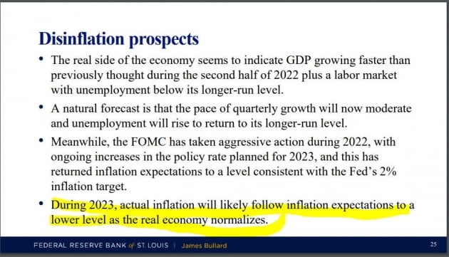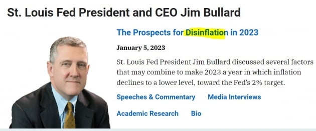 그런데 이런 어려움에 빠진 시장을 구원한 사람이 있었습니다. Fed에서 가장 강한 '매파'로 꼽히는 제임스 불러드 세인트루이스 연방은행 총재였습니다. 불러드 총재는 오후 1시 20분께 배포한 연설문(2023년 디스인플레이션 전망)에서 "2023년에는 실물 경제가 정상화되면서 실제 인플레이션이 기대 인플레이션을 따라 낮은 수준으로 떨어질 가능성이 크다"라고 밝혔습니다. 그는 "정책금리가 아직 충분히 경제를 억제하는 영역에 있지는 않지만, 점점 가까워지고 있다"라면서 "이는 낮은 인플레이션 기대와 결합하여 2023년을 디스인플레이션의 해로 만들 수 있다"라고 주장했습니다. 그는 디스인플레이션이란 인플레이션이 Fed의 목표인 2%대를 향해 떨어지는 것 뜻한다는 설명까지 달았습니다.