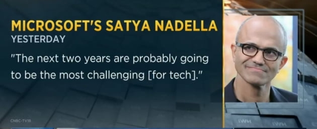 마이크로소프트의 사티아 나델라 최고경영자(CEO)는 어제 인도에서 한 연설에서 "향후 2년은 기술기업에 매우 도전적인 해가 될 것"이라고 말했습니다.