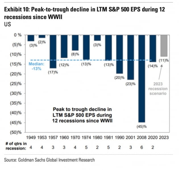 사토리 펀드의 댄 나일스는 "Fed와 싸우지 말라", "펀더멘털과 싸우지 말라"라는 지난해 두 가지 가장 중요한 테마는 올해도 유지된다고 밝혔습니다. 그는 "경기 침체가 없는 베어마켓은 일반적으로 하락 폭이 30% 미만"이라며 "침체가 없다면 S&P500 지수의 지난해 10월 저점(-25%)이 지켜질 수 있다"라고 봤습니다. 하지만 임금상승을 통제하기 위해 (Fed가) 400만 개의 초과 일자리를 파괴해야 하는 현 상황을 고려할 때 경기 침체가 심각해질 가능성이 크다고 봤습니다. 그는 "경기 침체를 수반하는 베어마켓은 통상 S&P가 40% 이상 하락하는 결과를 가져오는데, 이는 아직 이번 약세장의 저점을 보지 못했다는 것을 나타낸다. S&P500 지수는 3000에 달할 수 있으며, 최악의 경우 2400까지 떨어질 수 있다"라고 분석했습니다. 그는 과거 경기 침체 때의 이익 감소 폭을 고려하면 올해 S&P500 기업의 주당순이익(EPS)이 200달러에 가까워질 것으로 봤습니다. 여기에 역사적으로 소비자물가(CPI)가 3%를 넘을 때 주가수익비율(P/E)은 평균 15배라면서 3000을 제시했습니다. 특히 CPI가 5%를 넘을 때는 12배 수준에 그쳤다면서 2400까지 떨어질 수 있다고 봤습니다.
