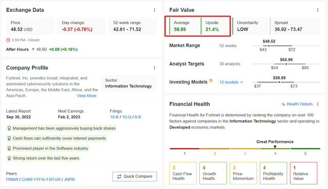 인베스팅프로의 정량 모델에서도 향후 12개월 내 포티넷 주가가 현재보다 21.4% 상승해 공정가치 58.89에 가까워질 것으로 제시한다.
