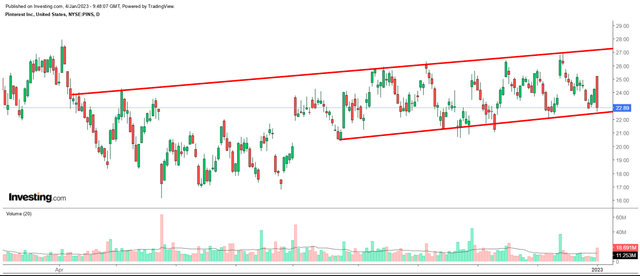 2022년 동안 핀터레스트 주가는 33.2% 하락했지만, 64.2% 하락한 메타 플랫폼스, 81% 하락한 스냅보다는 좋은 실적을 보였다.