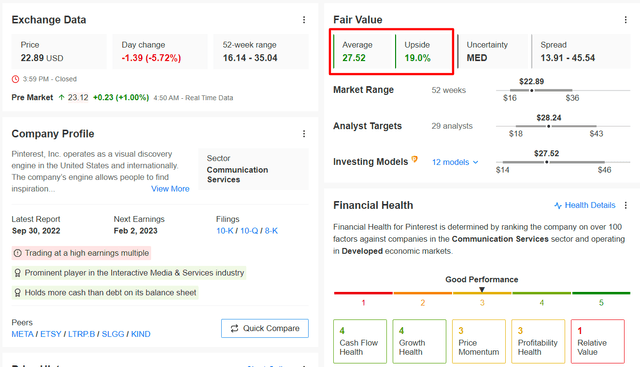 또한 여러 밸류에이션 모델에 따라 인베스팅프로에서 제시하는 핀터레스트의 향후 12개월 공정가치는 현 주가보다 19% 높다.