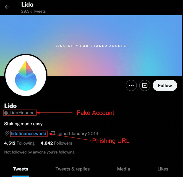 피싱 링크를 포함한 가짜 리도 파이낸스(Lido Finance) 트위터 계정에 대한 많은 사람들의 주의가 요구되고 있다.