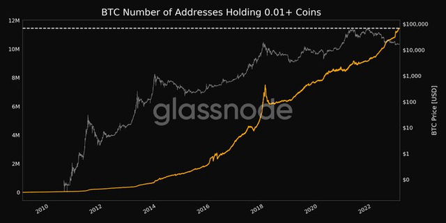 최소 0.01개 이상 비트코인(BTC)을 보유한 주소 수가 사상 최고치를 경신한 것으로 나타났다.