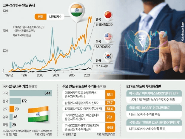 개미들이 인도 증시에 직접 투자하는 것은 아직 불가능하다. 상장지수펀드(ETF)나 해외주식형펀드를 활용해야 한다. 대표적인 인도 ETF는 미국에 상장된 '아이셰어스 MSCI 인디아 ETF'(종목명 INDA)다. 113개 기업을 편입한 MSCI 인도지수를 추종하는 상품이다.