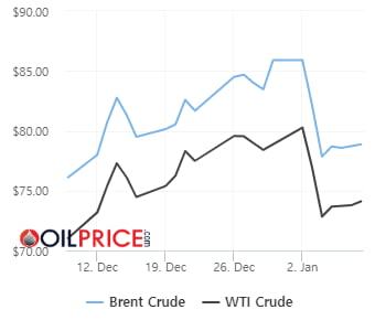 6일(현지시간) 뉴욕상업거래소(NYMEX)에서 2월물 서부텍사스원유(WTI)는 전일 대비 0.10달러(0.14%) 상승한 배럴당 73.77달러에 거래를 마쳤다. 런던 ICE선물거래소에서 2월물 브렌트유는 0.12달러(0.2%) 오른 78.57달러로 장을 마감했다. 연초 큰 폭으로 하락했던 유가가 하락분을 반납하고 회복하는 모양새다.