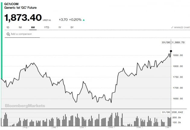 지난 6일(현지시간) 뉴욕상품거래소(COMEX)에서 금 선물(내년 2월물) 가격은 트로이온스 당 전거래일보다 1.6% 오른 1869.70달러에 거래를 마쳤다. 지난해 6월 초 이후 최고치다. 금값은 지난해 11월 3일 1630달러로 바닥을 찍은 뒤 상승 추세를 이어오고 있다.