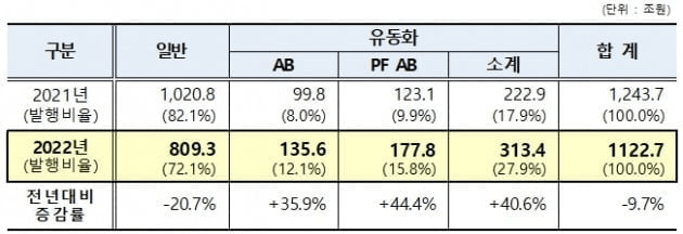 반면 유동화 단기사채는 313조 4천억원이 발행돼 전년(222조 9천억원) 대비 40.6% 늘었다.
